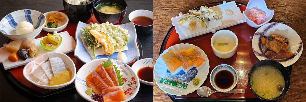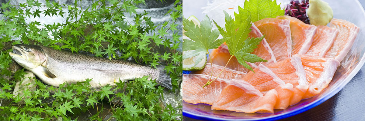 とくに、エゾイワナとカワマスを交配した西米良でしか味わえない西米良サーモンの刺身をメインにした「西米良御膳」、押し寿司で味わえる「ゆた~と御膳」。春、夏、秋、冬と四季のよって変わる旬の食材をふんだんに使った「四季御膳」。地こんにゃくの刺身や煮しめなど、西米良ならではの味が人気のメニューとなっております。