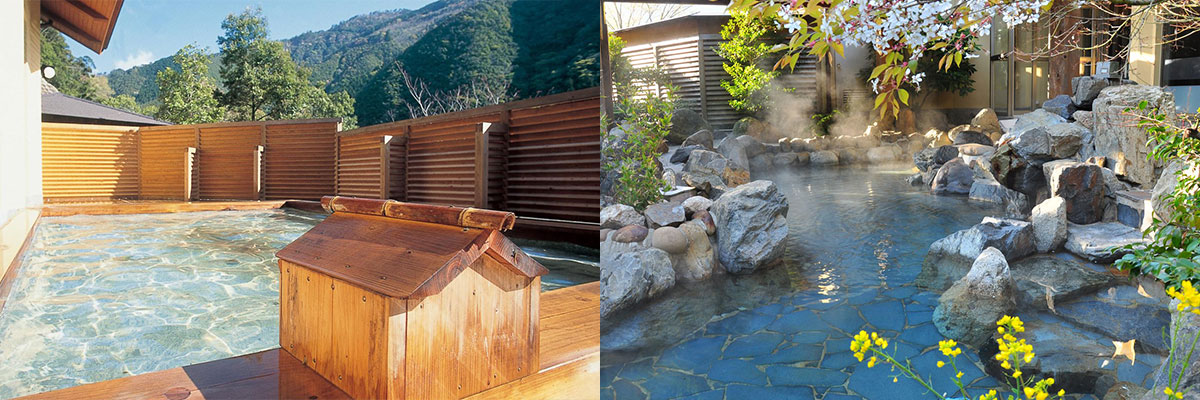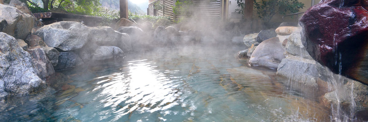 大浴場として、露天の岩風呂を備えた「川の湯」と露天のヒノキ風呂を備えた「陽の湯」、そして、小浴場として貸切でご使用いただけ、露天の岩風呂を備えた家族風呂「なごみの湯」がございます。